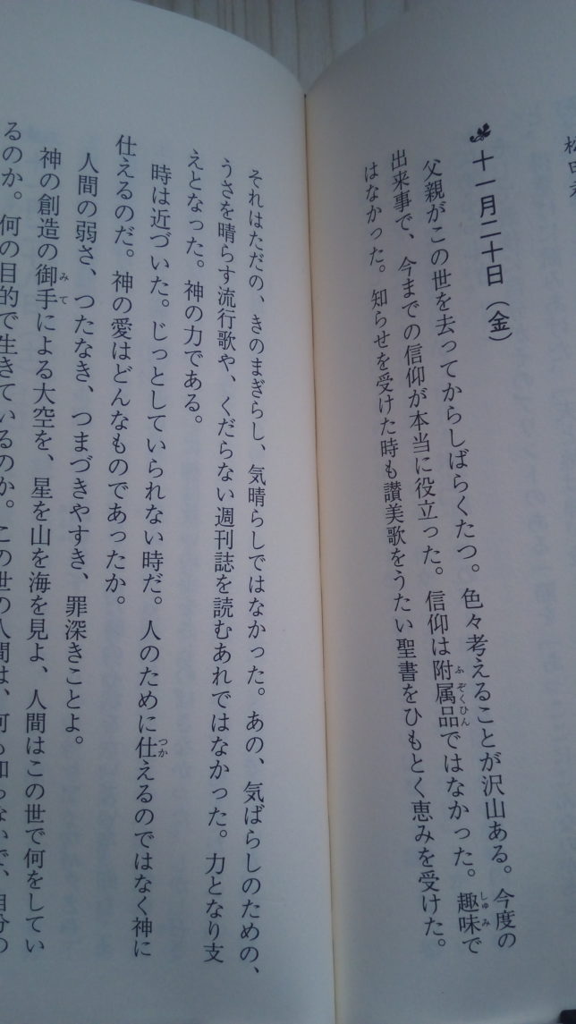 父親がこの世を去ってからしばらくたつ。色々考えることが沢山ある。今度の出来事で、今までの信仰が本当に役に立った。信仰は付属品でなかった。趣味ではなかった。知らせを受けた時も讃美歌を歌い聖書をひもとく恵みを受けた。それはただの、きのまぎらし、気晴らしではなかった。あの、気ばらしのための、うさを晴らす流行歌や、くだらない週刊誌を読むあれではなかった。力となり支えとなった。神の力である。